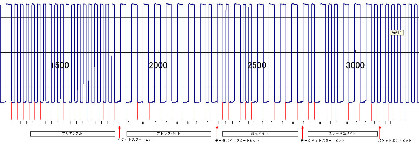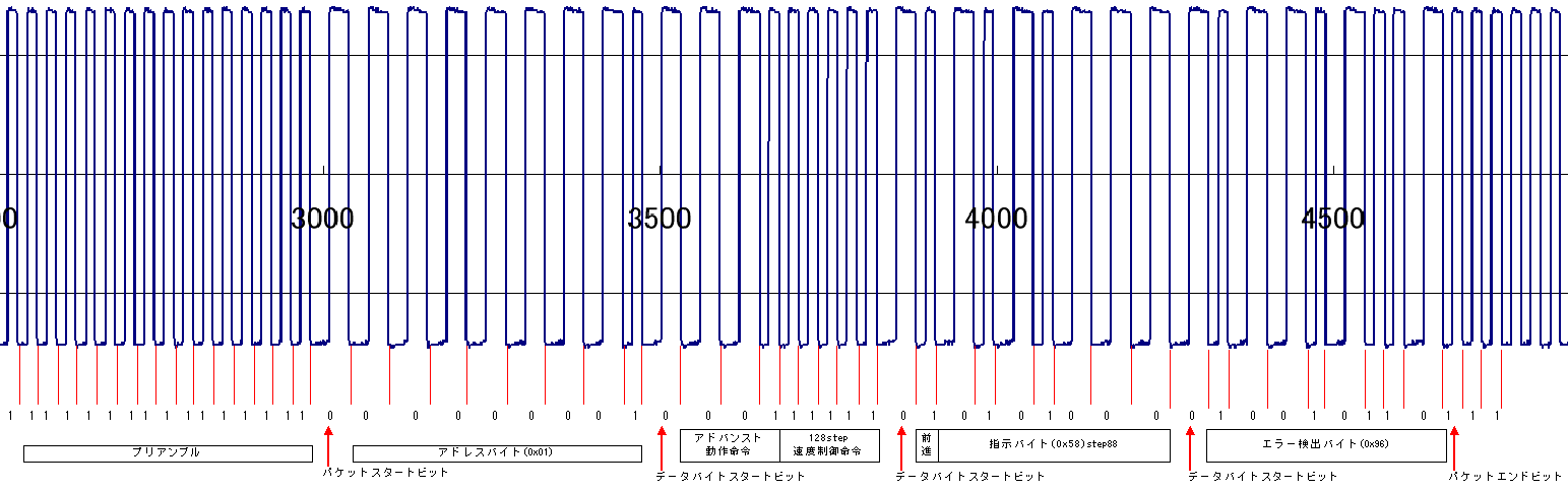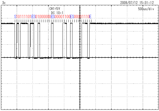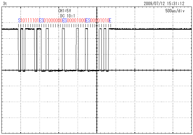 別件で、loconettestを使ってLocoNetでポイントを動かした時の波形(LocoNetは、下位から送信されると言うことで)