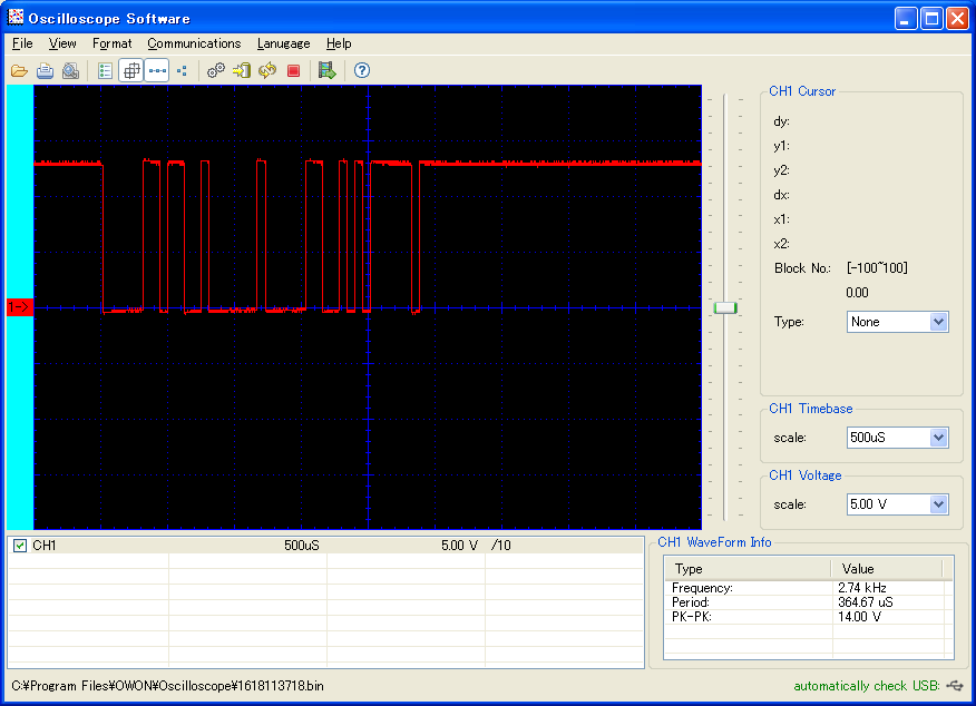 とりあえず、線路にオシロスコープを繋いで、デジタルオシロで取得した波形データをエクセル形式で取り込んでみました。